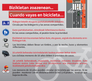 Primeramente, junto con Stop Accidentes, (que es una asociación de ayuda a familiares de víctimas de accidentes de tráfico, cuya sede en el País Vasco se encuentra en Durango) se confecciona un tríptico informativo. Este tríptico, que se difundió ampliamente mediante buzoneo, informa sobre la normativa a la hora de moverse por Durango, ya sea en bicicleta, en coche o a pie. Además, se permite dar una serie de consejos para facilitar la convivencia respetuosa de los diferentes usuarios. El Área de Personas Mayores del Ayuntamiento, se encargó de supervisar el contenido del tríptico e insistió en incidir especialmente en informar sobre la normativa que concierne al uso de bicicletas en espacios que son también peatonales (como se ve en la siguiente captura), pues es aquí donde nuestros mayores en se sienten más expuestos y es muy importante que el ciclista sea cauto para evitar accidentes.